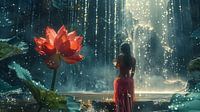 digitale spirituele schilderachtige afbeelding van fictieve mediterende vrouw met lotusbloemen en water