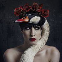 kunstzinnig digitaal beeld van een vrouw samen met een zwaan met egale achtergrond en studioverlichting
