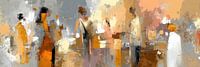 vrouw oranje | Amber Woman - Dit is een vrouw schilderij en tegelijk een abstract schilderij waarin warme oranje-oker vlakken en losse verfstreken domineren en een centraal silhouet van een vrouw met een schuine tas duidelijk naar voren brengt tussen grijs-witte accenten en vage figuren, ideaal als modern schilderij vrouw voor een…