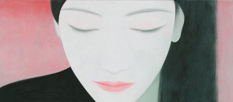 vrouw portret | Inkeer - Dit vrouw schilderij vangt je aandacht meteen door twee eenvoudige, maar heel consequente keuzes: een groot, wit gezicht met gesloten ogen en een diepe zwarte baan die het beeld rechts afkaderd. Het is een portret schilderij waarin de stilte zelf lijkt te zijn vastgelegd — niet als iets zwaars, maar als een…