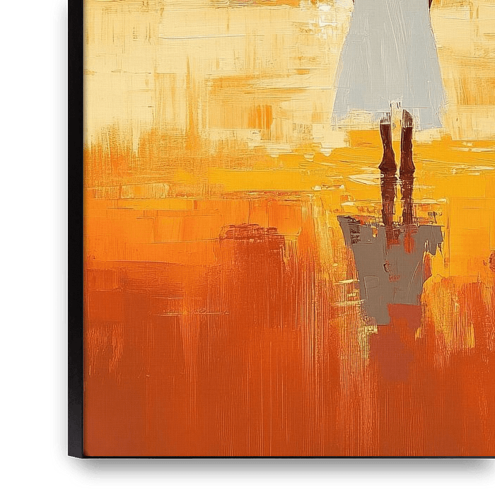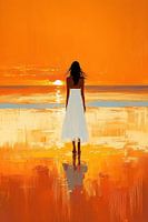 vrouw strand - Dit vrouw schilderij toont een silhouet van een vrouw in een witte jurk met de rug naar ons die naar een felle oranje zonsondergang boven de zee staart, met brede impressionistische penseelstreken en een lange reflectie in het natte zand — vrouw schilderij, schilderij vrouw.