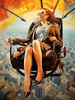 De surrealistische en elegante scène toont een vrouw in een zakelijk pak en een zonnebril, zwevend in een futuristisch ogende open leunstoel boven een uitgestrekte stad. Ze lijkt ontspannen en zelfverzekerd, met een document in haar hand. De achtergrond toont een gedetailleerd vogelperspectief van wolkenkrabbers en straten, bedekt met abstracte, kleurrijke vormen in oranje, geel en blauw, die doen denken aan de lucht of een soort energieveld. De compositie speelt met perspectief en combineert realistische en fantastische elementen tot een dromerig beeld.