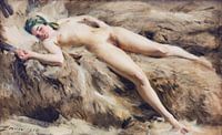 Koop dit schilderij vrouwelijk naakt, På vargen, Anders Zorn - 1918 van Atelier Liesjes als reproductie op canvas, aluminium dibond, (ingelijste) fotoprint, behang en ArtFrame, op maat geprint in Fine-Art kwaliteit.