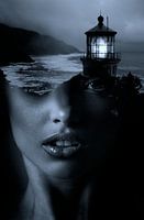 Portret met dubbele belichting van jonge vrouw en vuurtoren bij nacht Een portret met dubbele belichting is een foto die twee beelden combineert tot één beeld, waardoor een uniek en artistiek effect ontstaat. Het hoofdonderwerp is een jonge vrouw, wier gezicht gedeeltelijk wordt bedekt door een zwart-witfoto van een vuurtoren bij nacht.…