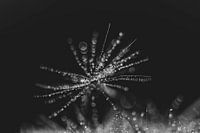 close up van het zaadje van een uitgebloeide paardenbloem, helemaal vol met dauwdruppels, en een zwarte achtergrond