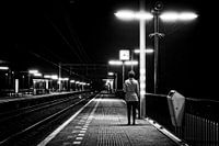 Een vrouw wacht op een verlaten treinstation op de laatste trein