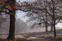 landschap op de Wolfhezerheide in Doorwerth, op een prachtige winterochtend, waar de zon door de ochtendnevel breekt