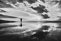wandelen op het Noordzeestrand bij een ondergaande zon in zwart-wit media