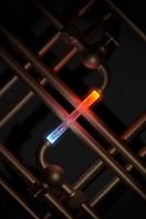 Surrealistisch beeld met kranen en waterleidingen en een veelkleurige waterstraal.