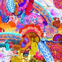 kleurrijk schilderij in warme kleuren, dit moderne werk is van een surrealistische stroming.