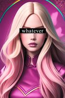 De minimalistische afbeelding van deze blonde vrouw, wiens ogen worden bedekt door een zwarte balk, creëert spanning en nieuwsgierigheid. De sarcastische uitdrukking "Whatever" in een stijlvol lettertype versterkt de artistieke provocatie van het beeld.