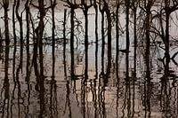 Brabantse biesbosch. Door het weglaten van de horizon en de weerspiegeling van de bomen in het water is een grafisch beeld ontstaan. Het opkomende zonnetje verzacht de sfeer.
