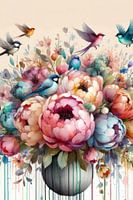 Dit is een digitaal beeld van een boeket watercolour bloemen in verscheidene kleuren. Er druipen druppels verf naar beneden. Het beeld bevat ook vogels in allerlei kleuren. Deze foto is erg kleurrijk.