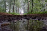 landschap op een wandelpad in het bos, met een laag standpunt gefotografeerd over een waterplas, wat voor een mooie reflectie zorgt