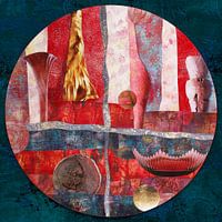 abstracte, ronde collage van gelliprints en afbeeldingen in rood en blauw