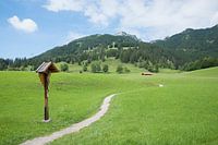 wegkruis op wandelpad Hochkreuth, bij Bayrischzell. voorjaarslandschap bovenste deelstaat van Beieren met uitzicht op de berg wendelstein