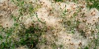 Een veld is bedekt met een dichte laag witte, donzige zaden of plantenmateriaal, afgewisseld met groene planten en een paar kleine paarse bloemen. Het lijkt alsof een massa katoenachtige substantie zich over de vegetatie heeft afgezet en een unieke natuurlijke laag vormt.