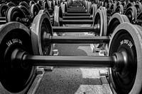 assen met ijzeren wielen voor treinwagons staan in rijen op voorraad bij een werkplaats voor treinen....ze doen denken aan zware halters die worden gebruikt in het krachthonk van de sportschool...