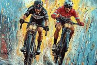 Twee wielrenners razen zij aan zij over een kronkelende weg, omringd door een regen overgoten landschap. Hun kleurrijke shirts contrasteren prachtig met de groene omgeving en lucht. De dynamiek van het schilderij vangt de snelheid en spanning van de race, terwijl de schaduwen op de weg de diepte en realiteit van het moment versterken.