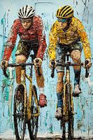 Twee wielrenners razen zij aan zij over een kronkelende weg, omringd door een regen overgoten landschap. Hun kleurrijke shirts contrasteren prachtig met de groene omgeving en lucht. De dynamiek van het schilderij vangt de snelheid en spanning van de race, terwijl de schaduwen op de weg de diepte en realiteit van het moment versterken.