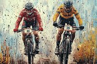 Twee wielrenners razen zij aan zij over een kronkelende weg, omringd door een regen overgoten landschap. Hun kleurrijke shirts contrasteren prachtig met de groene omgeving en lucht. De dynamiek van het schilderij vangt de snelheid en spanning van de race, terwijl de schaduwen op de weg de diepte en realiteit van het moment versterken.