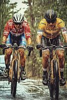 Twee wielrenners razen zij aan zij over een kronkelende weg, omringd door een regen overgoten landschap. Hun kleurrijke shirts contrasteren prachtig met de groene omgeving en lucht. De dynamiek van het schilderij vangt de snelheid en spanning van de race, terwijl de schaduwen op de weg de diepte en realiteit van het moment versterken.