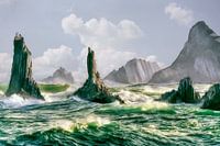 Kust in Asturias, Spanje. Alsof je je in Jurassic Park waant. Een prachtig wilde kust, geen mens te bekennen en de zee toont haar mooiste golven.