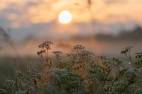 close up van een witte wilde plant, met op de achtergrond de nevel over de grond en de opkomende zon