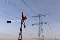 Oude windmolen onder hoogspanningsmasten in de polder van de Lage Vugt polder Breda, Noord-Brabant, Holland, Nederland. De oude windmolen die er voor zorgt dat het waterpijl in de sloot op de juiste hoogte wordt gehouden tegenover de gigantische hoeveelheid energie die getransporteerd woden over de hoogspanningsmasten. Tegenstellingen van oud en nieuw. Ook tegenstellingen van klein en groot, veel en weinig. Strakblauwe lucht bij zonsondergang met in de verte enkele onopvallende hoge wolken op de horizon. De horizon is niet in beeld gebracht om de onderwerpen te isoleren van de omgeving. Op de wieken van de molen is duidelijk roestvorming waarneembaar. de oneffenheden in de vorm van de bladen benadrukken het oude karakter van de molen. Met deze foto wordt harmonie bereikt in de vele tegenstellingen die aanwezig zijn. Het lijnenspel accentueert de oneindigheid in deze compositie. afbeelding molen afbeelding lucht afbeelding elektriciteit afbeelding elektriciteitsmast