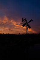 Fotoprint van een windmolen bij zonsopkomst in de Schermer polder. Door het Sahara zand in de lucht kleurde de lucht extra fel oranje.