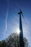 een windmolen in de namiddagzon op het Ecopark in Waalwijk. De sterke wind heeft een recht condensspoor van een vliegtuig verstoord.