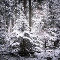 Winterlandschap van een besneeuwd wit bos met oude bomen.