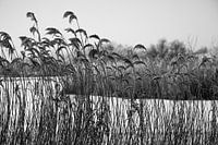 Rietkragen langs het bevroren water van een poel in zwart-wit