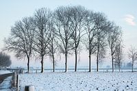 Een bijna grafisch beeld van een besneeuwde bomenrij tegen een winterse blauw, roze lucht. Op de voorgrond weiland met sneeuw en links een weggetje dat in de einder verdwijnt. De foto is gemaakt op een vroege en koude winterochtend en brengt de oprijlaan van boerderij Rijsbrug aan de Binnenweg in Houten in beeld. Het lege landschap achter de bomenrij is verleden tijd omdat hier nu de aansluiting naar de A12 in aanleg is.