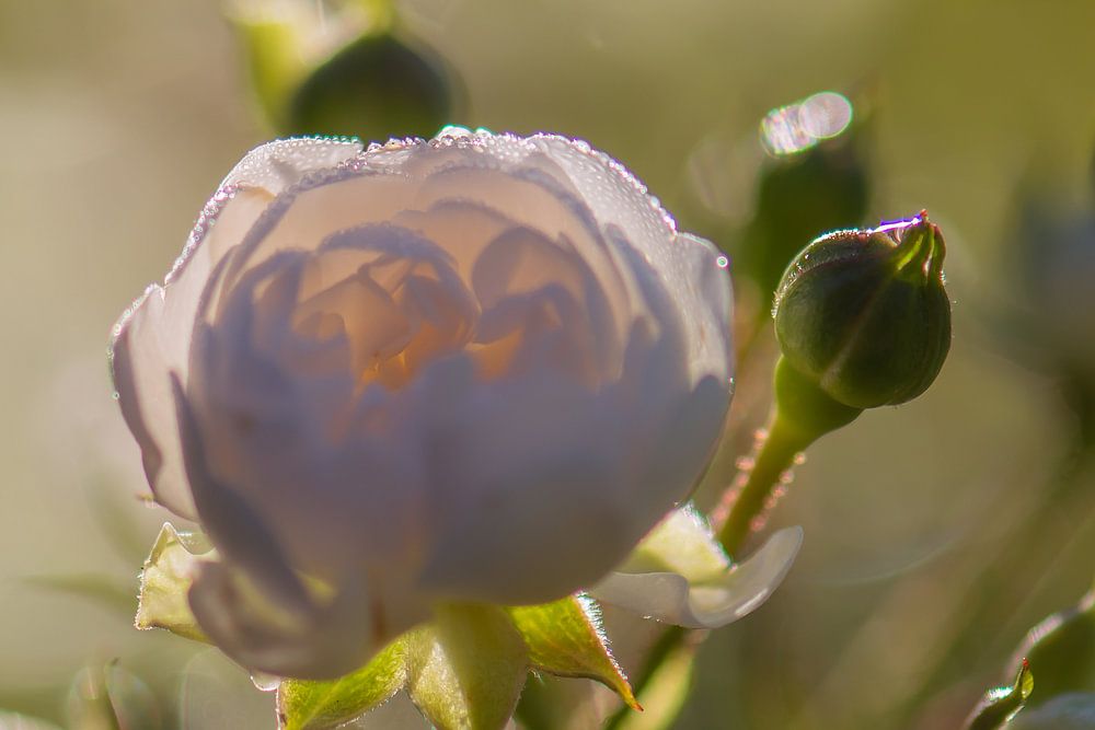 close up van klein wit roosje in de ochtendzon met bokeh achtergrond