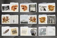 9 kleine collages van afbeeldingen, bladeren, stof en dichtregels over herinneren, op een achtergrond van stof