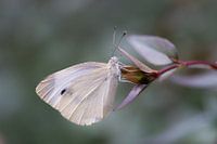 zachte koude kleuren macro van een witje dat op een bloemtak zit te rusten