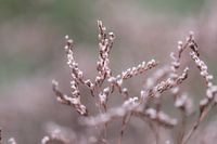 zachte close up van een bruine herfstplant met witte bloesem, met een pastelkleurige achtergrond