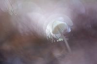 Een witte paddenstoel in paarse achtergrond met sunflaire. De Mycena adscendens