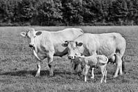Mooie scène met een witte stier, koe en hun pasgeboren kalf samen in een weide met een bosrand op de achtergrond
