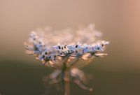 close up van een witte wilde bloem in het gouden licht van de opkomende zon