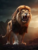 Een woeste brullende leeuw, vastgelegd in dit intense beeld, straalt kracht en majesteit uit. Zijn imposante manen omlijsten een furieus gezicht dat doordrenkt is van wilskracht en dominantie. De blik in zijn ogen is intens, terwijl zijn geopende muil een krachtige brul laat horen. Dit portret vangt de essentie van de wilde natuur en de ontembare geest van de leeuw.