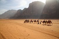 Kamelen tocht door Jordanië. Na een overnachitng in de woestijn per kameel weer terug naar het dorp om verder te kunnen reizen