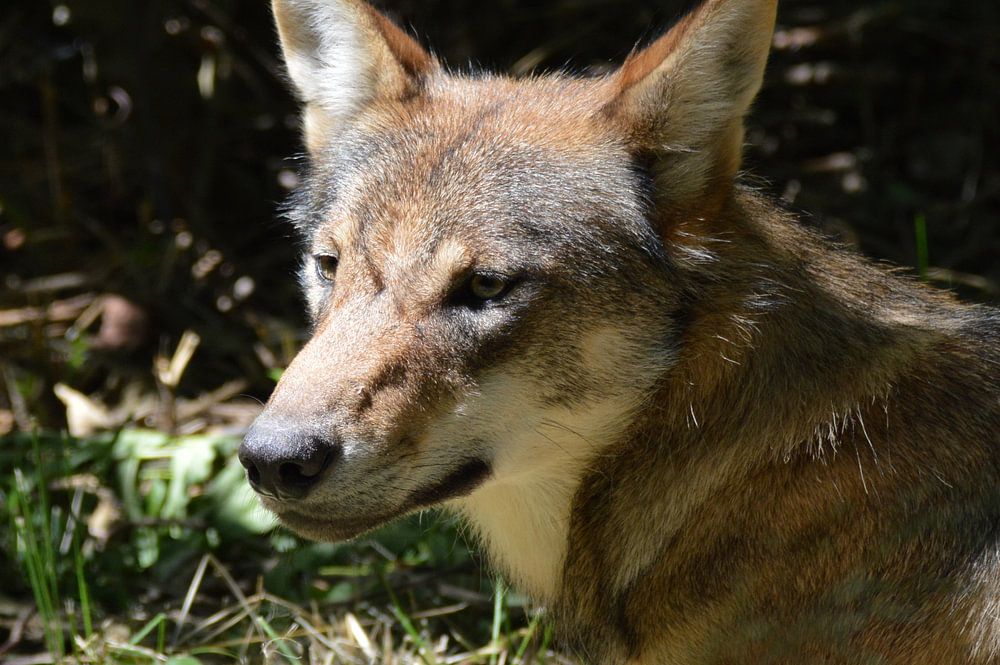 een wolf geniet van de middagzon, lekker liggend in het gras