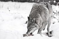 Koop de foto wolf op witte sneeuw met een stuk vlees. het beest is op zijn hoede, het sneeuwt. Verkleurd, zwart e van Michael Semenov als print op canvas, aluminium dibond, (ingelijste) fotoprint, behang en ArtFrame. Voor jou op maat geprint in Fine-Art kwaliteit.