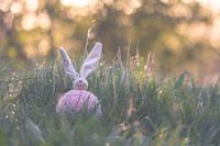 stilleven voor Pasen, waar een paashaas poppetje met een wollige dikke buik in het hoge gras met dauwdruppels zit, waar de ochtendzon op schijnt, wat voor een warme en glinsterende sfeer zorgt.