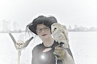 a modern day witch with a barn owl, in winter