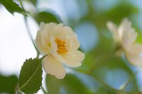 zachte macro van een wit klein klimroosje met geel hart, blauwe lucht op de achtergrond