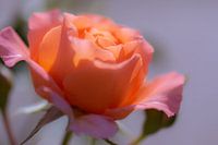 zachte close up van een oranje roos met blauwgrijze achtergrond