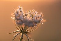 close up van een witte wilde bloem die straalt door het gouden licht van de zonsopkomst